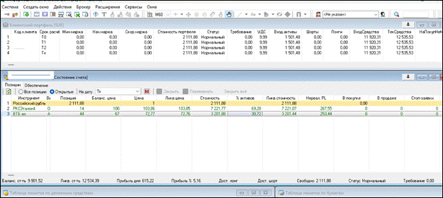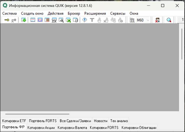 После регистрации и входа в QUIK открывается основной рабочий стол, на котором показаны следующие окна: