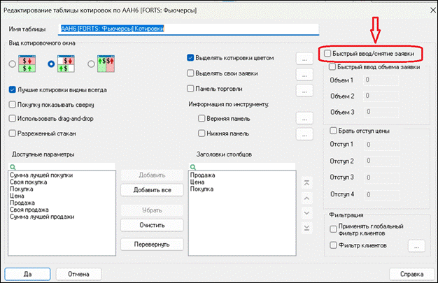 Включается так: правый клик по стакану → Редактировать таблицу → Быстрый ввод/снятие заявки.