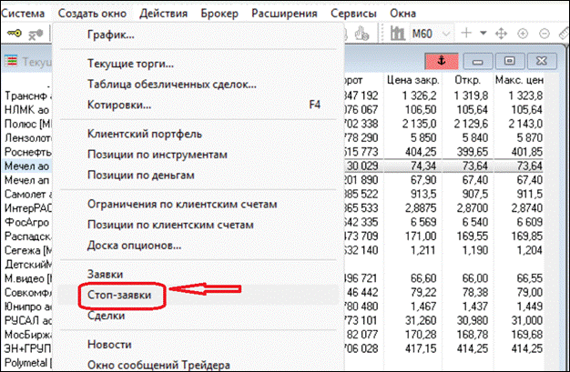 Окно стоп-заявок находится в меню: Создать окно → Стоп-заявки.